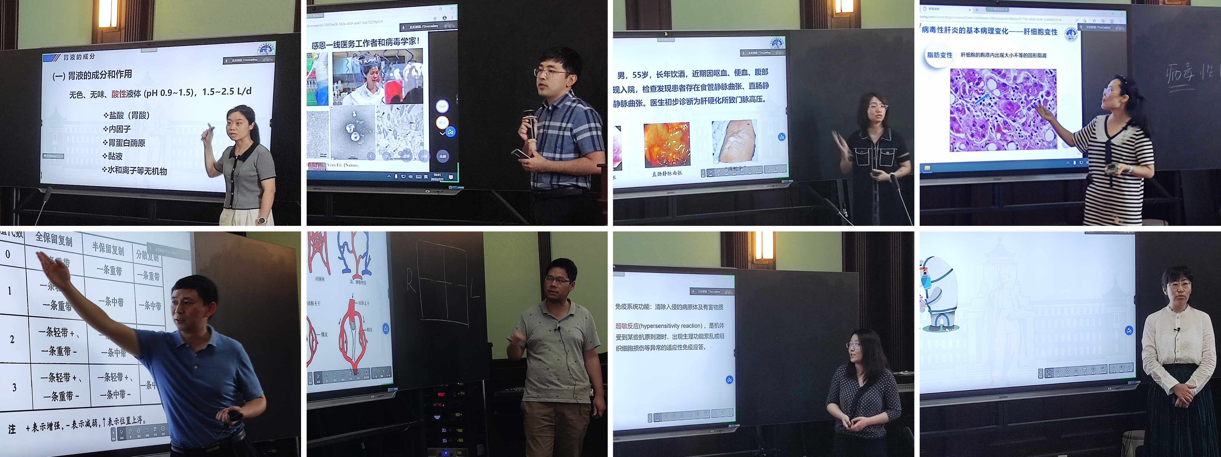 参赛教师们准备充分、语言流畅、教态自然、思路清晰、教案完整,彰显了基础医学院中青年教师良好的教学面貌和专业素质。评委从总体设计和教学内容、教学方法与手段、教学技能、教学效果、教学特色及教案设计等几方面进行综合评分,并对比赛过程中教师的PPT和板书设计、师生互动和课程思政融入等提出合理化建议。