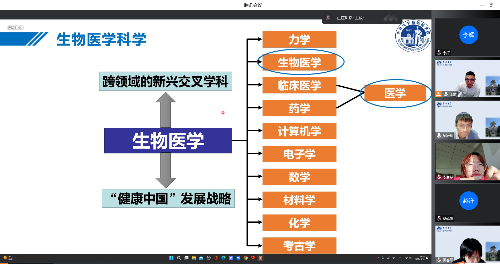 10月18日下午3点25分,基础医学院生物医学科学专业2022级本科生迎来第一节专业课。基础医学院院长王放教授与20名本科生相聚“云端”,为同学们讲授《生物医学科学导论》之生物医学科学领域的“卡脖子”技术。