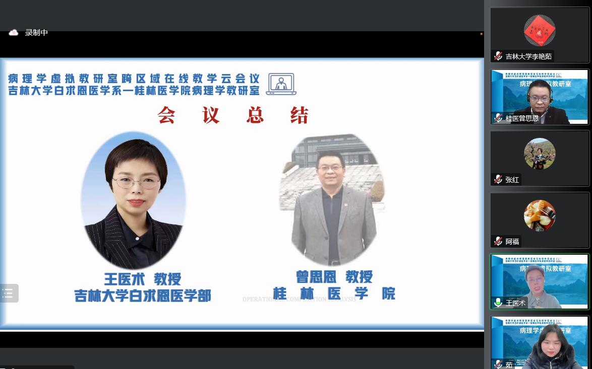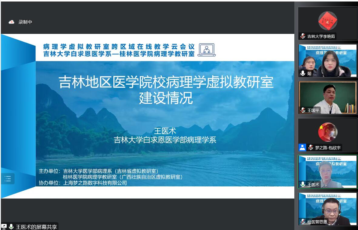 为了贯彻落实立德树人根本任务,依托虚拟教研室,开展教育教学研究交流活动,全面提高教师教书育人能力;坚持协作共享,加强跨校、跨地域的教研交流,推动高校协同打造精品教学资源库、优秀教学案例库、优质教师培训资源库等,推动互联互通、共建共享。2023年2月15日,由吉林大学基础医学院病理学系和桂林医学院病理学教研室两所省级虚拟病理学教研室共同主办以及上海梦之路数字科技有限公司协办,联合吉林广西医学高校病理学教研室共同参加的跨区域在线云备课正式开启。