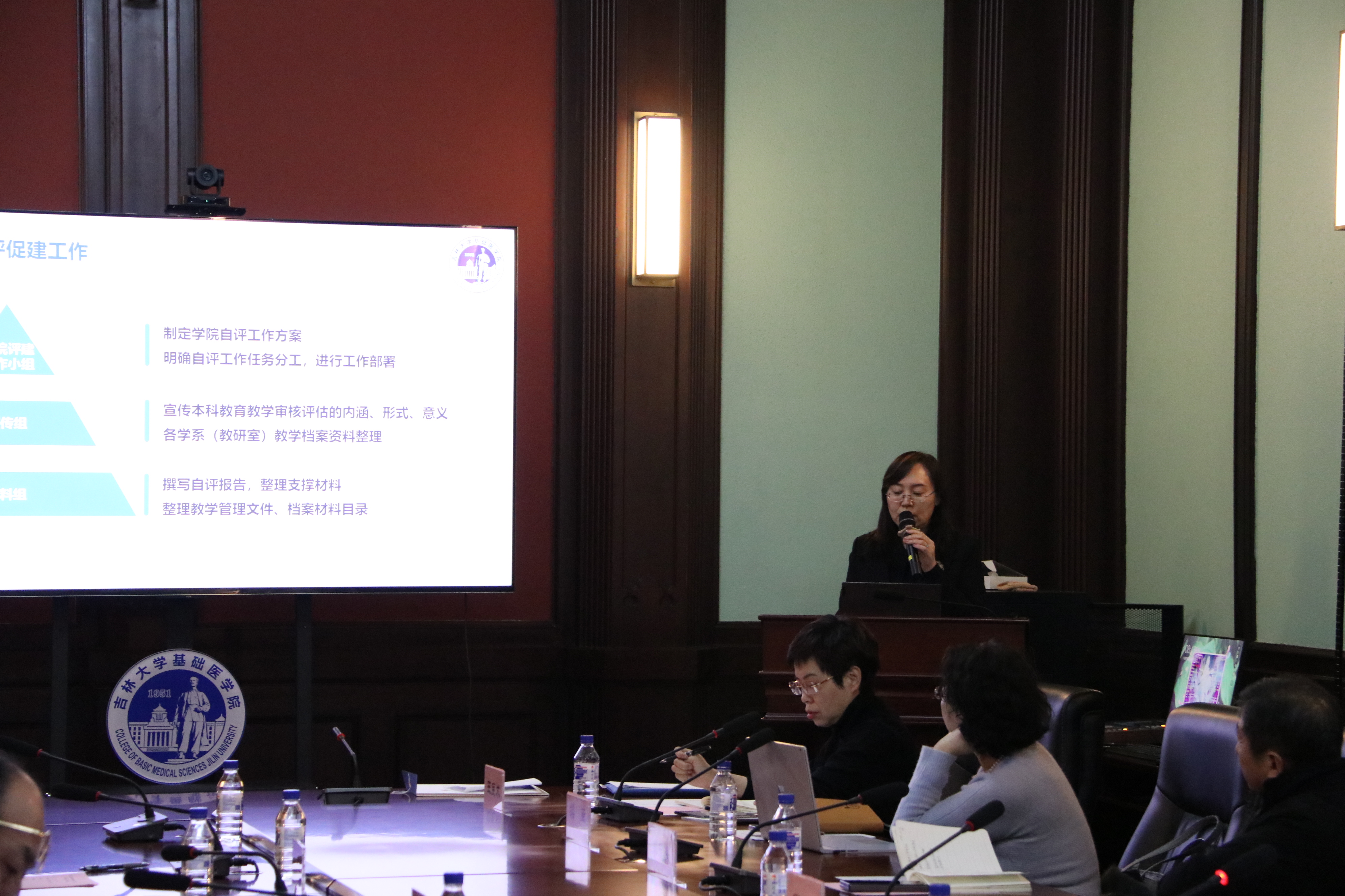 辛颖副院长代表全院师生真诚感谢并热烈欢迎各位专家莅临基础医学院指导教育教学审核评估。她从学院迎评促建、学院教育教学工作、学院教育教学存在的问题及整改措施三个方面进行了汇报。
