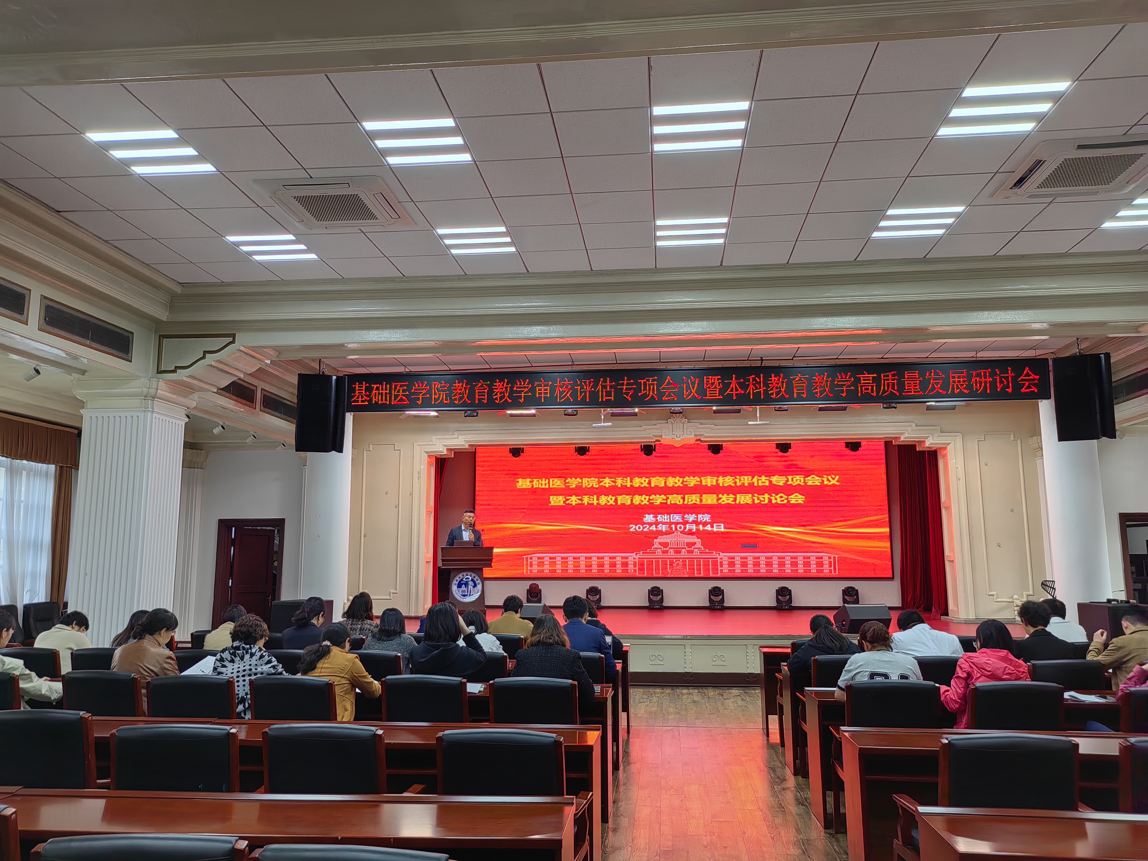 为深入落实立德树人根本任务,提高人才培养质量,全面做好本科教育教学审核评估迎评工作,基础医学院于2024年10月14日下午在基础楼二楼学术报告厅召开本科教育教学审核评估专项会议暨本科教育教学高质量发展研讨会。会议由学院院长王放教授主持,学院党政领导班子、学院教学委员会委员、学院教学督导组、各学系(教研室)主任及教师代表40余人出席此次会议。