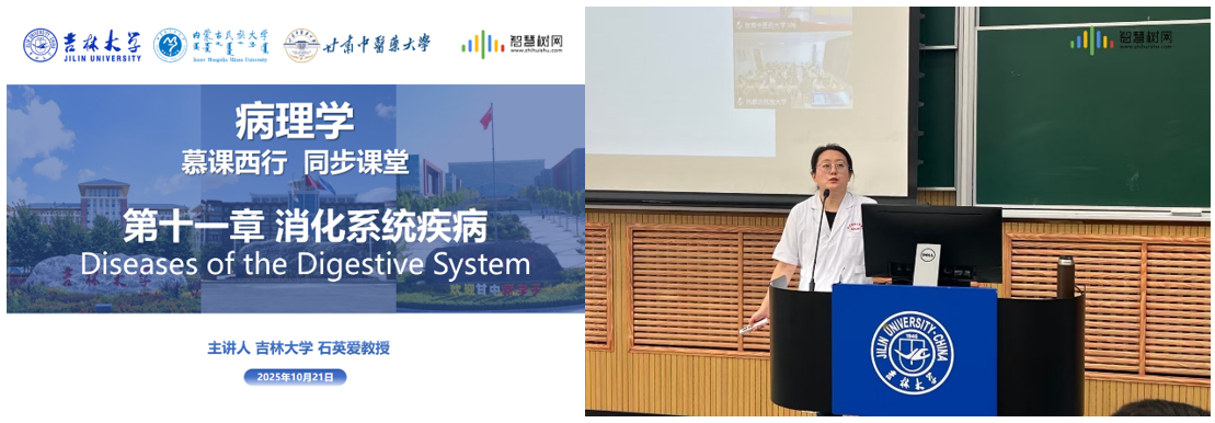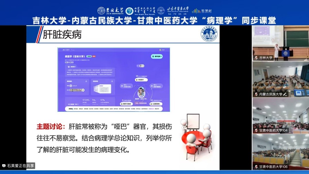 2025 年 10 月 21 日,吉林大学基础医学院与内蒙古民族大学、甘肃中医药大学三校云端聚首,依托 “智慧树” 在线教育平台,成功开展了《病理学》同步课堂活动。这是继《病理学AI课程》新形态教研西行(二期)项目后,三校在医学教育领域的又一次深度融合实践。