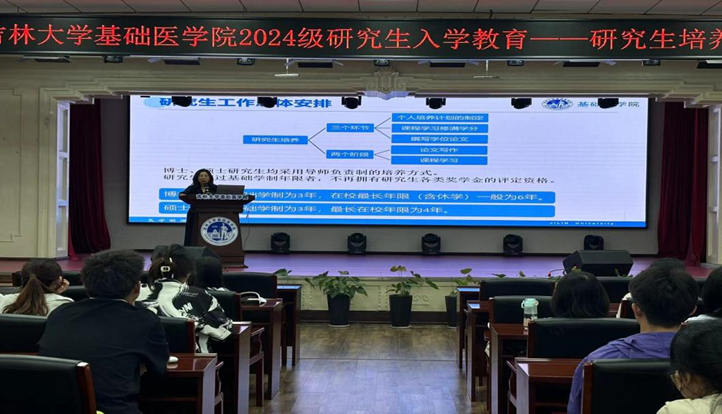 为引导研究生新生尽快适应新环境,完成从本科生到研究生角色的转换,以饱满的精神投入到崭新的学习生活中,吉林大学基础医学院于8月26日下午,在学院二楼学术报告厅开展以“研究生培养流程”为主题的2024级研究生新生入学教育。培训由综合办公室主任丁红枫主讲,学院研究生工作团队及2024级全体新生参加会议。