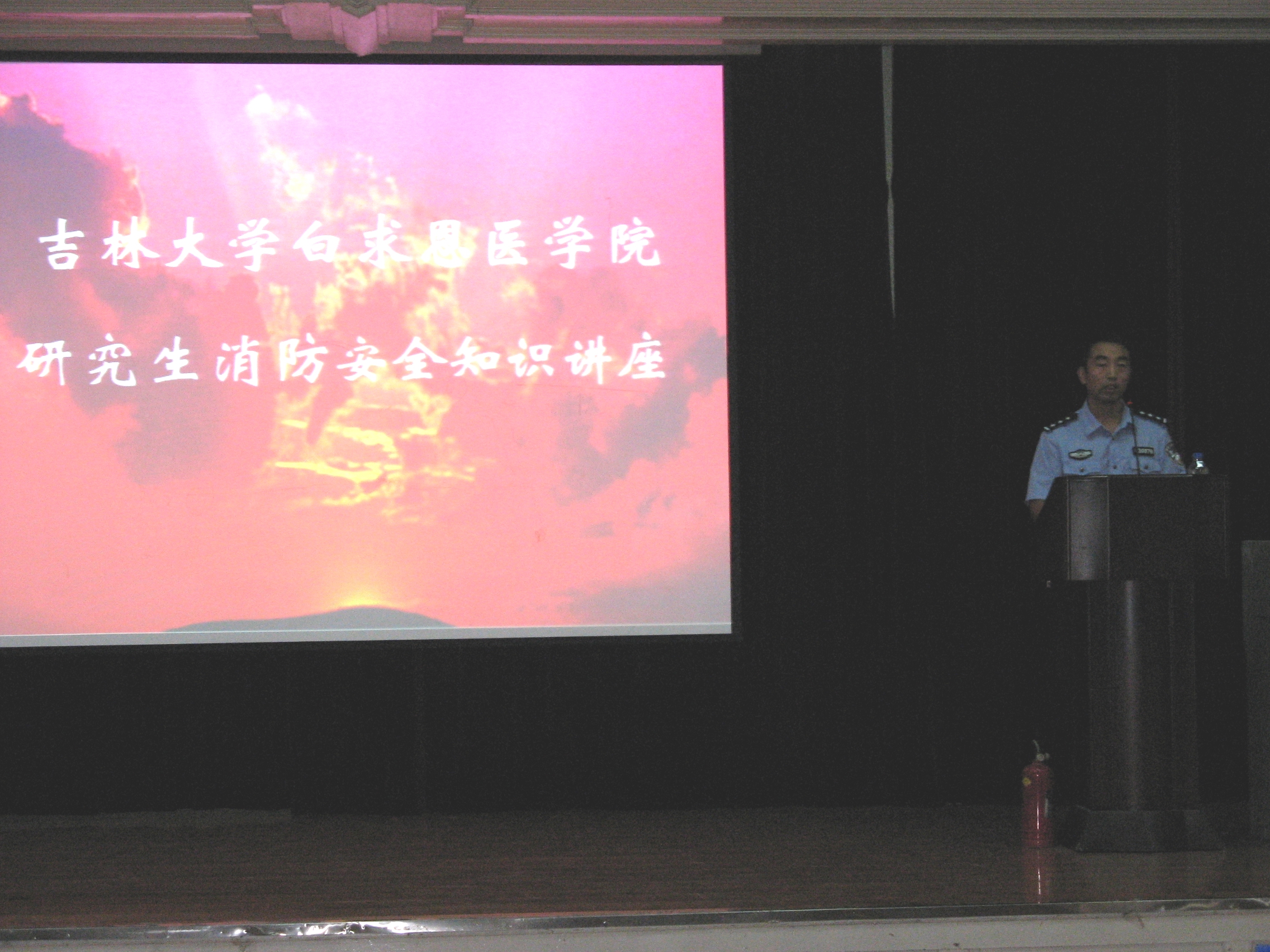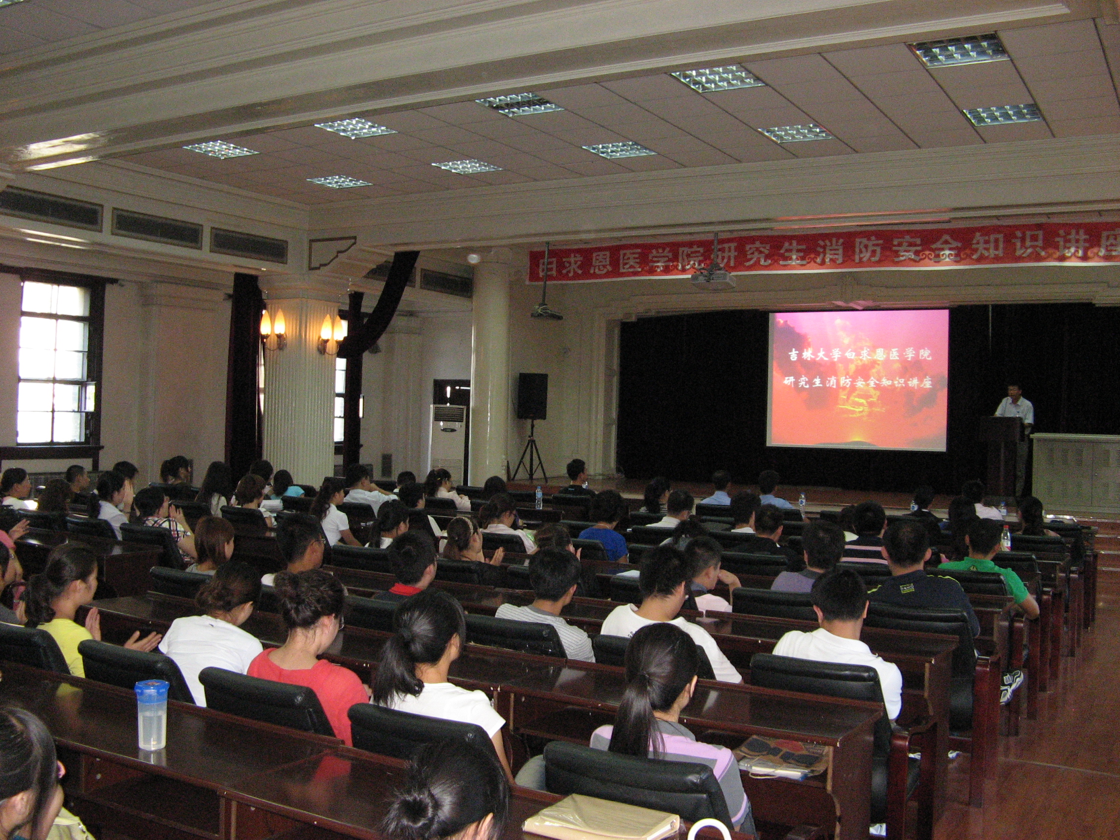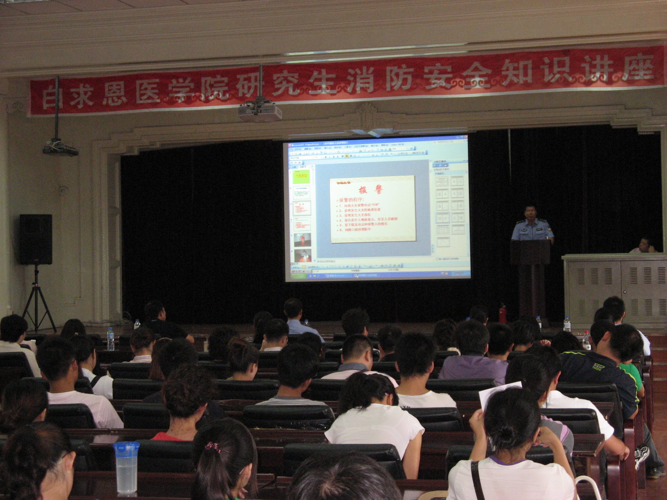 8月31日下午,白求恩医学院邀请新民校区保卫办科长安志成老师和郭云秀老师在基础二楼多功能报告厅为2010级研究生新生进行了消防安全知识讲座。学院党委副书记费淑波、研究生办公室主任陈野、新民校区保卫办两位老师和2010级全体研究生共同听取了此次讲座。讲座由学院研究生会主席杨晓春主持。
