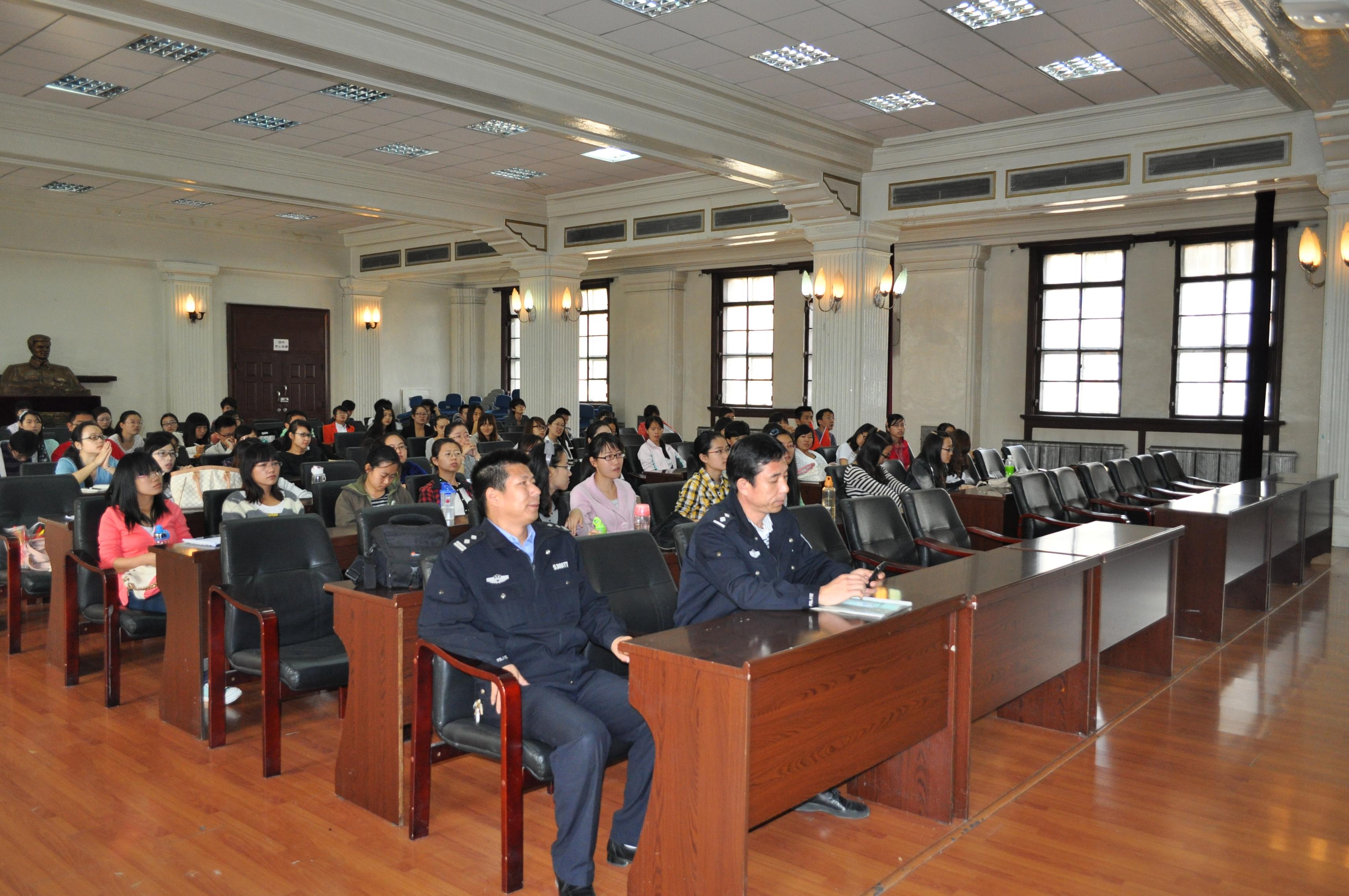 安科长给同学们详细讲解了火灾发生的主观因素,并从火灾的突发性、严重性、复杂性等方面介绍了火灾的严重后果。同时详尽的阐述了防火的主要措施以及科学灭火的主要方法。他重点强调了实验室安全问题,提醒同学们面对实验室里存放的爆炸物品、易燃物品和腐蚀品等化学危险品,一定要保证存放位置安全,并按照要求规范使用。最后,他从治安方面强调了同学们要注意交通安全、寝室安全以及教室安全等。