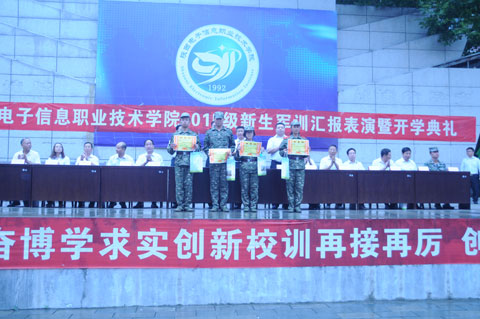 军训汇报表演在庄严的国歌声中拉开了帷幕。伴随着嘹亮的解放军进行曲,常务院长穆耀辉在军训指挥长的陪同下检阅了军训方队,参训新生进行了分列式表演、花样队列、五步拳和合唱军歌表演。汇报表演结束后,军训团副参谋长贾永强宣读了《关于表彰2015级军训优秀连队、文明宿舍和先进个人的决定》,主席台就坐的领导为获奖集体和个人颁发了荣誉证书及奖品。