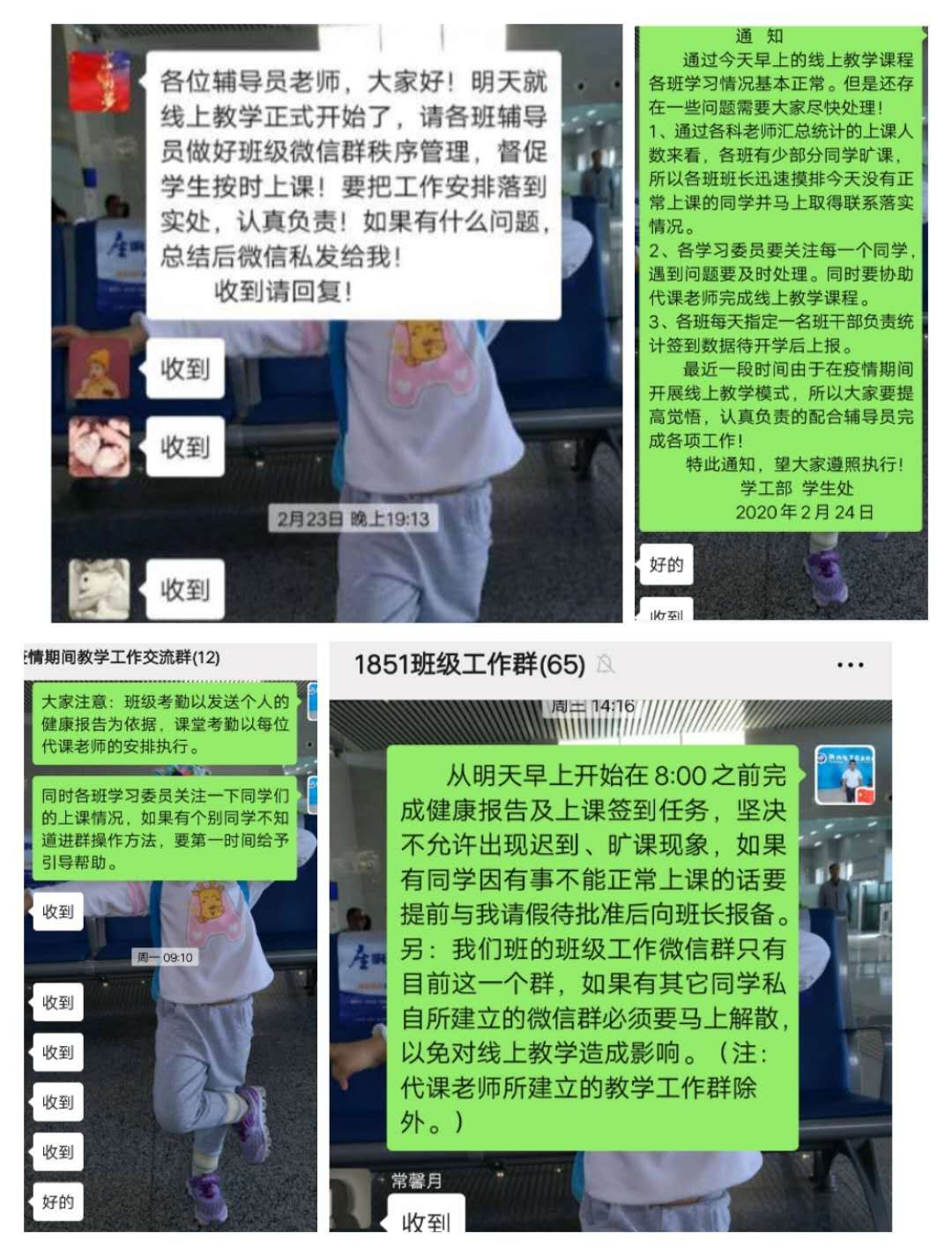 学校做出确定2月24日开始线上教学的决定后,学工部(学生处)立即落实学院的安排部署,细化工作流程并下发通知,要求每位辅导员在开课前,利用QQ、微信等召开班委会和班会,确保各项教育教学工作有序推进,如期开展网络教学工作,妥善安排疫情防控下的教学任务,真正做到“停课不停学”。确保工作落实到位,确保与延期开学后的教学顺利衔接,确保通知到每位学生,保证学生学习跟上教学进度,引导学生延期开学期间能够主动学习,充分利用好线上学习平台,有目的、有笔记、有状态的开展学习,要求细致摸排学生线上上课硬件条件是否具备,线上测试是否顺利,掌握学生开课情况,课后及时反馈,做好学生的宣传动员工作。