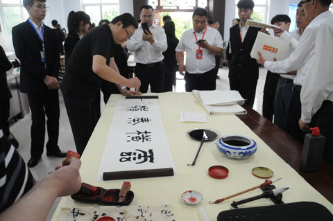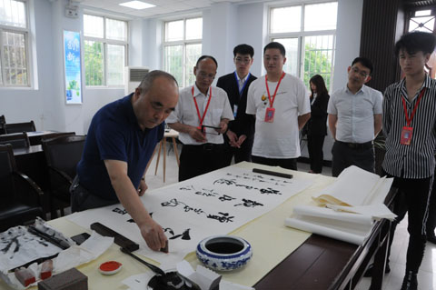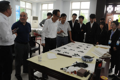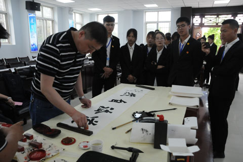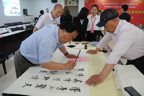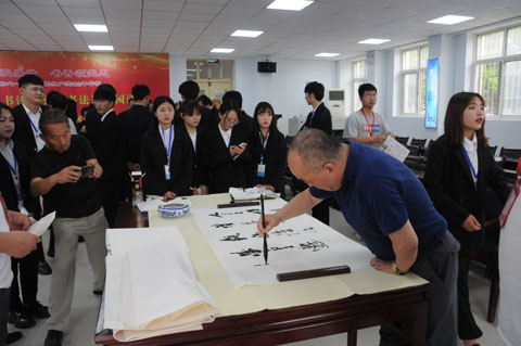 活动现场书香浓郁、墨香四溢。书法家们一边挥毫泼墨,一边向师生详细讲解书法艺术的发展历程、书法的练习技巧等,师生们驻足一旁,聚精会神地观赏创作,现场称赞声此起彼伏。(图/应序康 文/马放奇)
