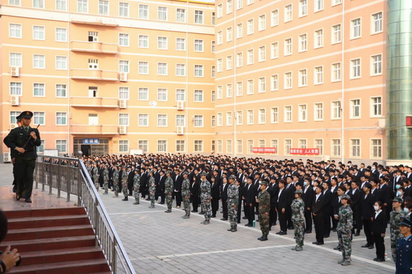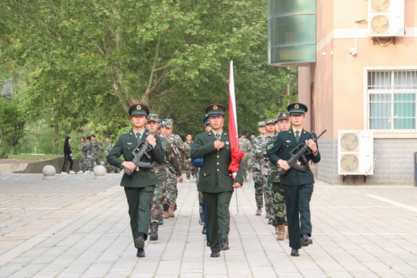 在全体师生行注目礼下,国旗护卫队队员们护送鲜艳的五星红旗,行礼完毕,伴随着庄严的《中华人民共和国国歌》,五星红旗冉冉升起,迎风飘扬。在场的每一个人向国旗行注目礼,深怀对祖国无限的热爱和崇高的敬意。