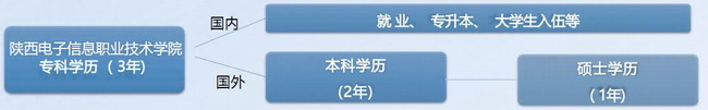 学生在我院三年修完教学计划规定的全部课程,成绩合格,颁发陕西电子信息职业技术学院普通高校专科毕业证书。专科毕业后,进入白俄罗斯维捷布斯克国立大学和白俄罗斯国立经济大学进行本科和硕士阶段学习 ,在白俄罗斯读三年(两年本科、一年硕士),毕业获得白俄罗斯大学相应本科和硕士研究生学位 、中国教育部给予学位认证。