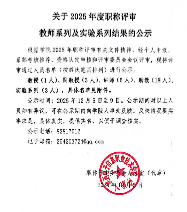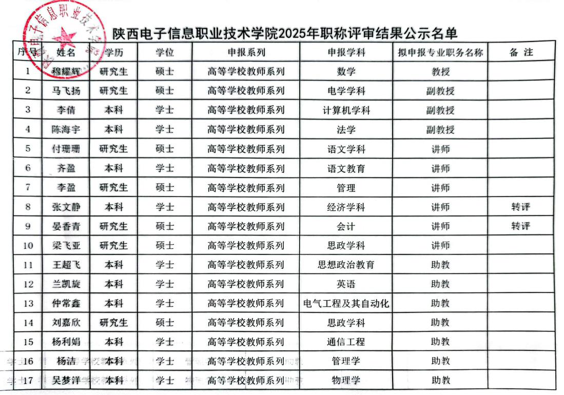 陕西电子信息职业技术学院2025年职称评审结果的公示