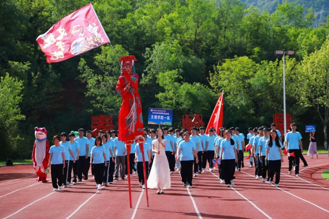 紧随其后,校旗方队与彩旗方队意气风发。彩旗如波浪翻涌,斑斓色彩在风中舞动,恰似青春跃动的音符。“严谨、扶助、实践、自立”八个字在旗帜上熠熠生辉,化作本届运动会铿锵有力的精神旋律,承载着学子们对信念的执着追寻。
