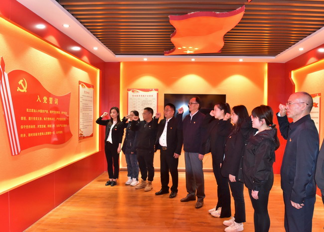 参观结束后,全体党员面向党旗,举起右拳,重温入党誓词,坚定政治信念。
