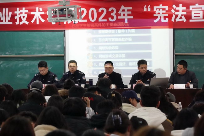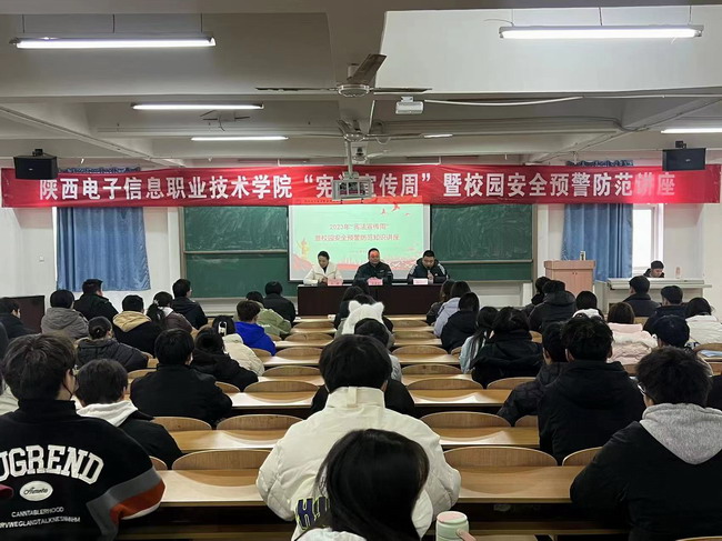 一是为弘扬宪法精神,切实增强青少年的法治意识和自我保护能力,让宪法走进校园,走进学生心里,在宪法宣传期间,我院邀请蓝田县公安局公安干警深入开展“12 . 4”国家宪法宣传进校园活动,工作人员采取设立宣传台、悬挂横幅标语、发放宣传资料、讲解宪法知识等方式,向学生们讲解了《宪法》、《民法典》、《国家安全法》等法律法规,科普了预防犯罪、禁毒防邪、法律援助、防电信诈骗、反家庭暴力等与学生息息相关的日常知识。