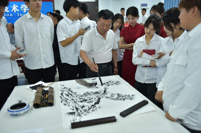 院党委书记石光华,院理事长、院长王明星到现场指导。院党委委员、副院长李泽宇向作家超然(郝文鹏)颁发了荣誉证书。100余名师生代表参加观摩了此次书画交流活动。活动由党政办副主任田金峰主持。