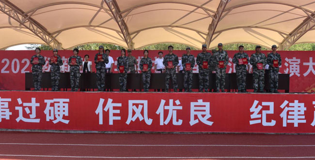 在军训期间,同学们不怕吃苦、顽强拼搏,涌现出了一批先进集体和个人。军训团参谋长杜斌代表学院宣读了表彰军训先进集体和个人的决定。决定授予十一连军事训练优秀集体,六连内务卫生优秀集体,二连作风纪律优秀集体,十三连精神文明优秀集体荣誉称号;授予吕小龙等7名同志“优秀教官”荣誉称号;授予张欣怡等13名同志“优秀辅导员”荣誉称号;授予吕梦洲等26名同学“军事训练优秀个人”,授予陈逸飞等26名同学“作风纪律先进个人”,授予赵娜等26名同学“内务卫生先进个人”,授予张翔雨等26名同学“后勤保障优秀个人” 荣誉称号;授予李智隆、何孟洁等240名同学“优秀学员”荣誉称号。学校领导为这些优秀集体和个人颁发了荣誉证书,以表彰他们在军训中的出色表现。