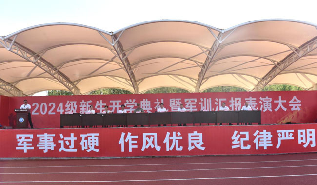 9月16日上午,我院2024级新生开学典礼暨军训总结表彰大会在学校标准田径运动场隆重举行。院理事长、院长王明星出席会议并讲话。副院长年小望,纪委书记马放奇,副院长李泽宇,副院长石晓英等院领导和嘉宾在主席台就座。全体新生身着整齐的军训服装,精神抖擞地迎接这一重要时刻。大会由副院长、军训团政委李泽宇主持。