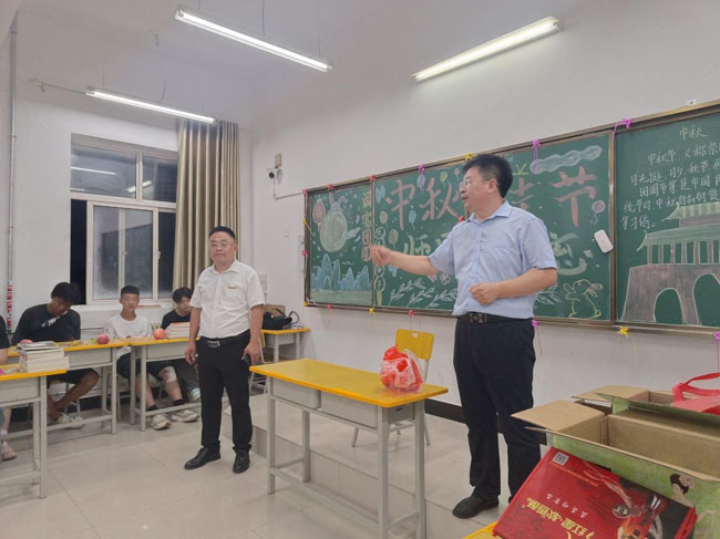 在这金秋送爽、丹桂飘香的美好季节里,我们迎来了又一个中秋佳节。在这个象征团圆的美好时刻,为了让学生们感受到家的温暖,9月17日,“中秋之夜”,理事长、院长王明星在各部门负责人陪同下,带着精心准备的月饼、水果及其它节日礼品,走进了各个教室,不仅为学生们带来了节日的问候,还详细了解了同学们的学习情况和生活状态,鼓励大家积极向上,努力学习。