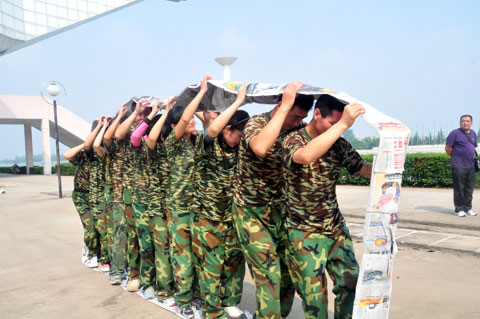 用一堆的报纸和两卷胶带,花15分钟制作成一个可以容纳全体队员的履带,进行传送,脚不能离开履带范围,履带不能断开,先到的队为胜利方。看似简单的游戏,做起来却不容易,队员的分工,履带的长度该多长的,如何使用有限的材料,队员的排列是否合理、步伐是否整齐都影响着比赛的结果。当两队都到达终点时,大家都感叹团队协作真的很重要,一个人的步伐错了,整个队伍都会乱。