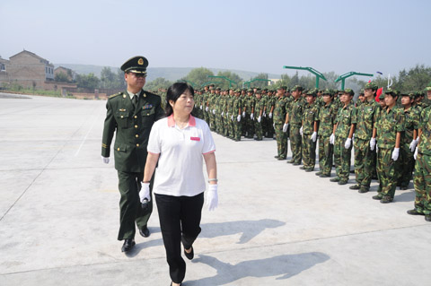 伴着激昂的解放军进行曲,在军训总指挥员整队向学院领导报告后,2011级新生军训汇报表演拉开了帷幕。党惠清院长在军训师三团团长惠云龙的陪同下检阅了军训方队,“同学们好!”——“首长好”,“同学们辛苦了!”——“为人民服务!”。一声声嘹亮的口号回荡在运动场上空。