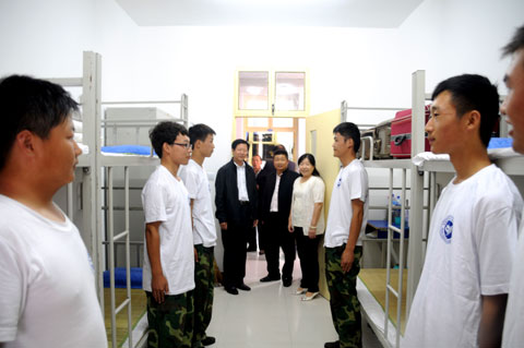 2012年9月10日(是第28个教师节)上午11点,院长党惠清、党委书记史军胜、院理事会理事长兼常务副院长穆耀辉、副院长陈建铎及各系主任,在学生处处长田志岗陪同下深入军训场和宿舍,亲切看望新生。训练场上,新生认真训练,动作整齐划一,口号响亮坚毅,他们整肃的军容和良好的综合素质得到了院领导的充分肯定。院长和书记与负责军训的教官和各位带队辅导员交谈,了解新生近日军训情况,对他们的辛勤工作给予了肯定。