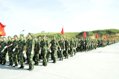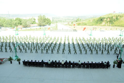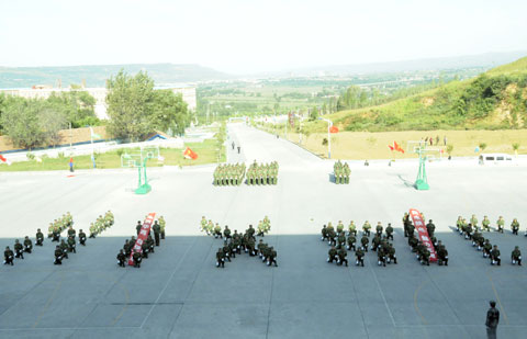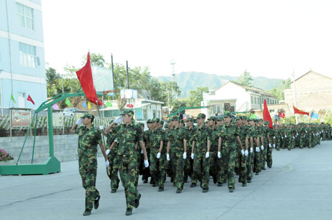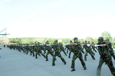 紧接着,军姿威武的2012级新生,排着整齐的队列,迈着整齐的步伐,喊着响亮的口号,依次通过主席台,展现了他们在12天军训中所取得的可喜成果和当代大学生的风采。阅兵式结束之后,进行了新生女子花样队列表演和新生男子拳术基本功表演、教官军体拳表演、新生团体五步拳表演。