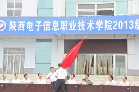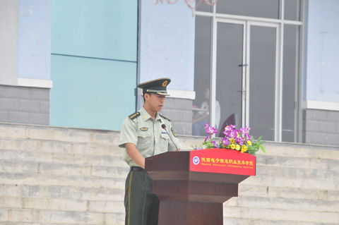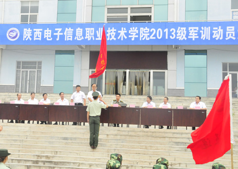院理事会理事长穆耀辉向军训团授予了团旗。学生处处长、军训团参谋长田志岗宣读了2013级新生军事训练实施计划。军训团副参谋长杨超宣读了“优秀连队、先进个人和文明宿舍”评选办法。新生代表赵锦炎和教官代表王国强先后在大会上发了言。