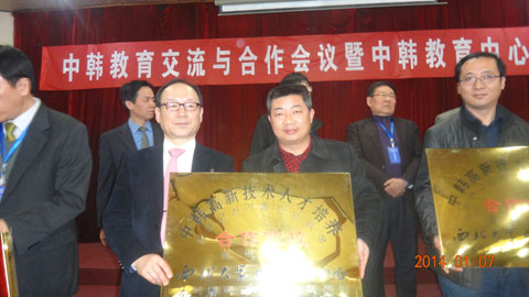 2014年1月8日,我院理事长穆耀辉及相关领导受邀参加了在西北大学举行的“中韩高新技术人才培养基地”合作院校签约及授牌仪式。出席仪式的有西北大学校长方光华,大韩民国驻西安总领事馆总领事全哉垣,陕西省教育厅、西安高新技术产业开发区管委会、三星西安工业园及韩国6所高校相关领导,陕西工业职业技术学院、杨陵职业技术学院、陕西职业技术学院、陕西电子信息职业技术学院等陕西12所高职院校的领导和相关代表100余人。